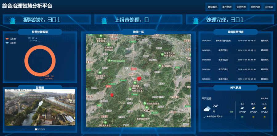 依托中国铁塔丰富的通信基站资源,新昌县已完成世纪佳苑、石溪北、长丘田三个高空瞭望点的安装建设,并通过综合治理智慧分析平台实现可视化监控。该系统利用高清红外热成像监控设备,结合视频智能分析平台,对秸秆、垃圾焚烧进行全天候360°自动巡航实时监控,发现疑似烟火后立即报警,以便于及时处理,截至10月上旬已累计报警处理事件301起。